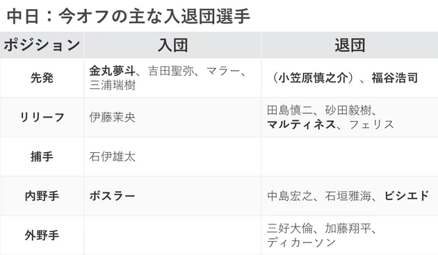 2022年から3年連続最下位となり、井上一樹新監督にチームの再建を託した中日。今オフは、昨季チーム最多の24試合に先発した小笠原慎之介がポスティングシステムによるメジャー挑戦を表明し、救援陣では絶対的な守護神だったマルティネスが退団するなど、上位進出には既存戦力と新戦力の奮起が求められる状況といえる。