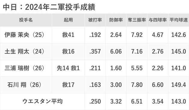 昨季、ルーキーながら開幕一軍入りを果たした土生翔太も注目したい若手の一人。二軍では奪三振率、与四球率ともにリーグ平均より優れた数字をマーク。被打率こそ3割台と振るわなかったものの、ポテンシャルの高さは折り紙付きの剛腕投手だ。