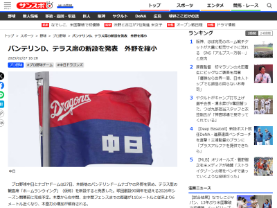 バンテリンD、テラス席の新設を発表 外野を縮小
