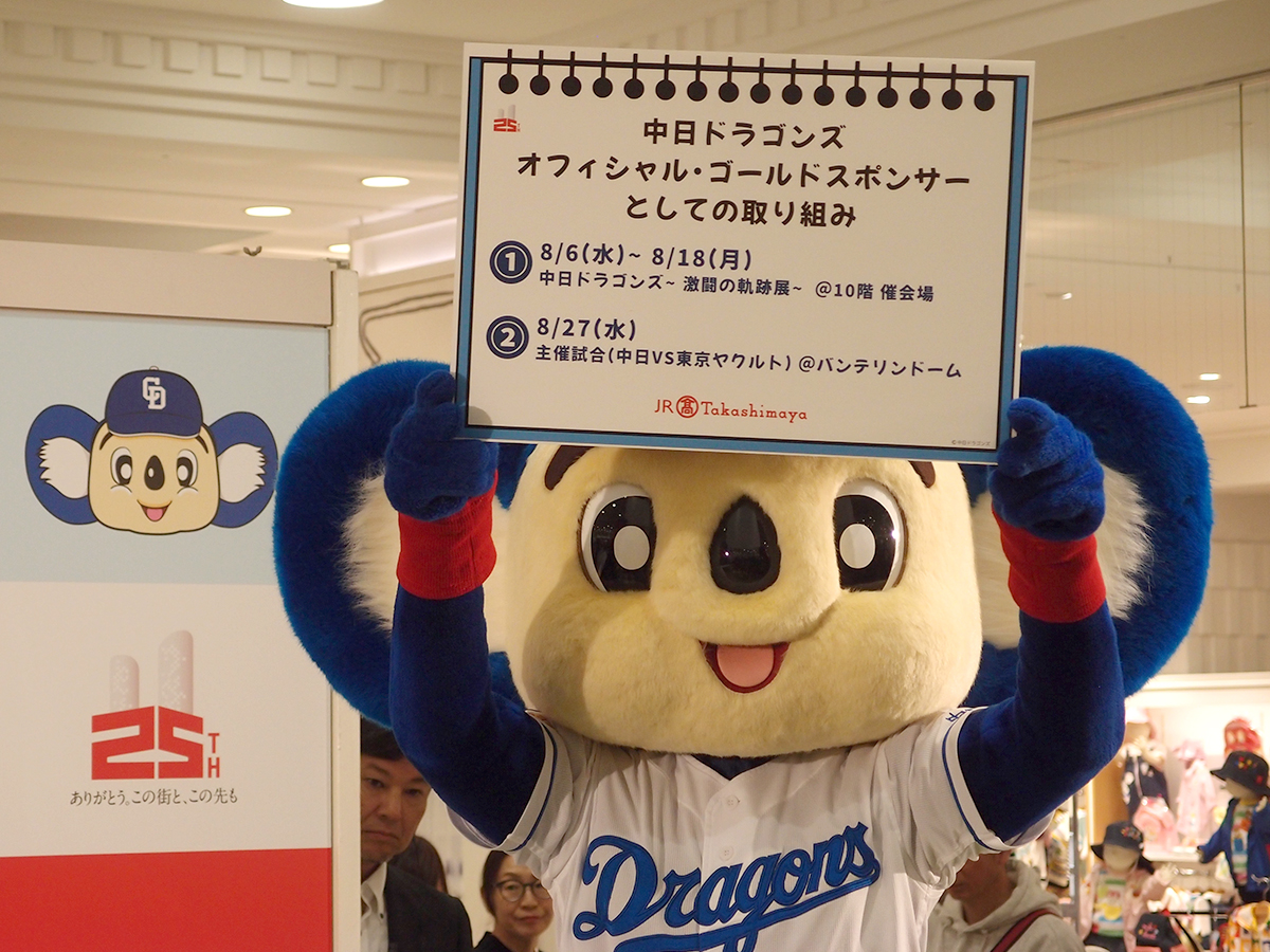 中日ドラゴンズのユニホーム姿の高島屋マスコット「ローズちゃん」披露!#ドアラ さんがていねいに紹介してくださいました🐨⚾️名古屋タカシマヤの開業25周年企画で、8月には展覧会や主催公式戦も! pic.twitter.com/LBwpVc2uzn