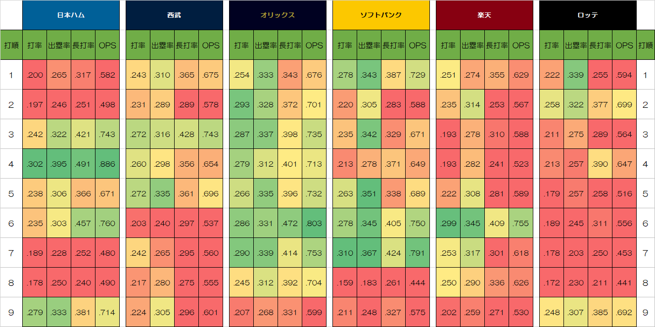 プロ野球、各球団のスタメン打順別打撃成績一覧