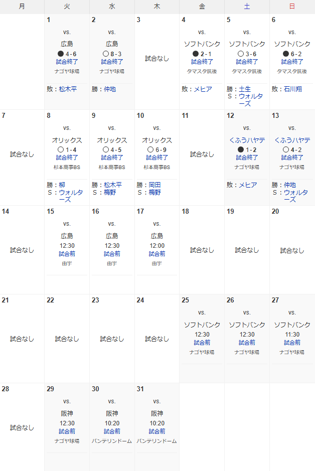 2025年07月14日 16:15 0コメント 中日ドラゴンズのもとけ次は由宇で試合へ、今月末からバンテリンドームでの試合も 中日ドラゴンズ2軍、今後の試合日程 ツイート シェア はてブ 送る Pocket ■2025.07.14 中日ドラゴンズ2軍試合日程【7月】 バンテリンドームでの中日ドラゴンズ先発投手陣練習に4人の投手が参加する 7月15日(火)からのセ・リーグ公式戦「阪神vs.中日」3連戦、阪神側の先発投手3人が判明する 今後の試合日程です。《このブログの更新通知をTwitterで受け取る》《コメント投稿フォームまで移動する》 にほんブログ村 中日ドラゴンズランキング