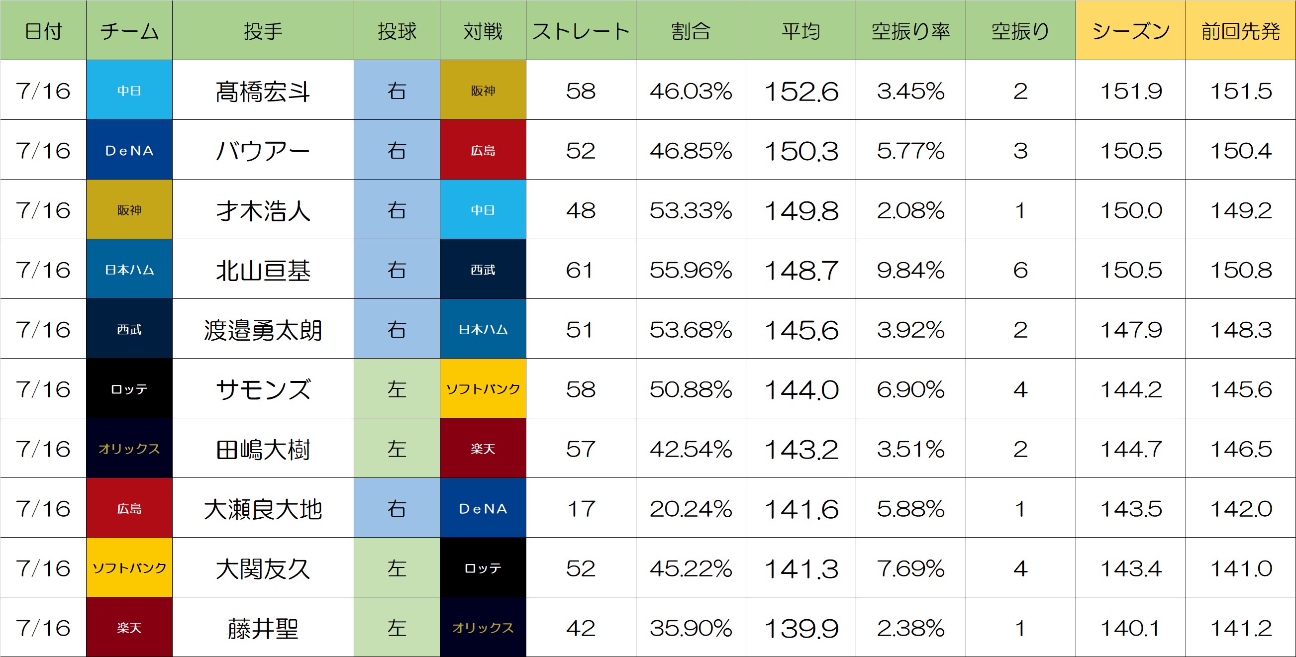 7/16 先発投手ストレート平均球速