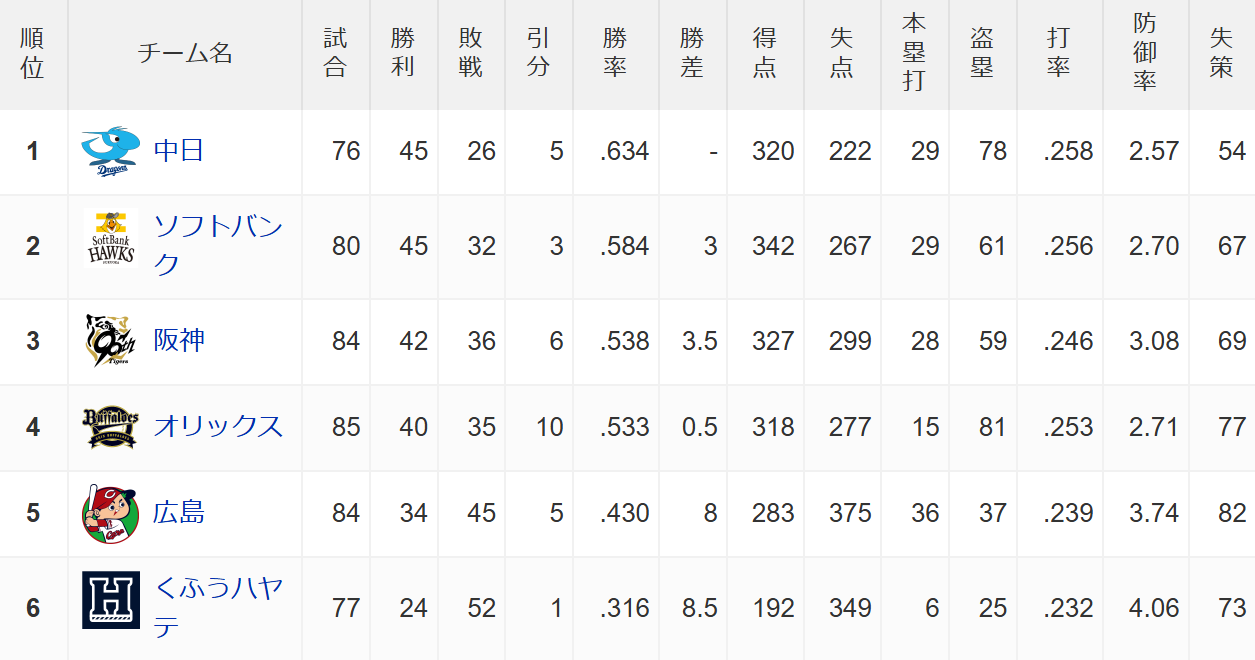 中日ドラゴンズランキング