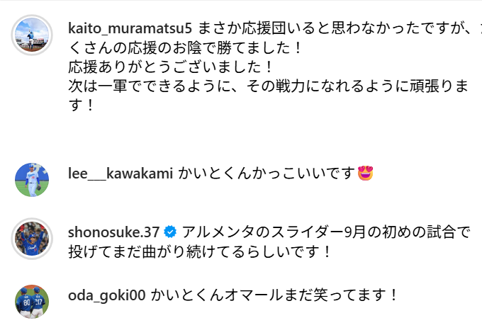 2025年10月05日 15:30 6コメント プロ野球のもとけ中日・濱将乃介、村松開人へ「アルメンタのスライダー 9月の初めの試合で投げてまだ曲がり続けてるらしいです!」 ツイート シェア はてブ 送る Pocket ■2025.10.05 村松開人(@kaito_muramatsu5)さん | Instagram この投稿をInstagramで見る村松開人(@kaito_muramatsu5)がシェアした投稿 中日・村松開人の“現状” 中日・濱将乃介、根尾昂、尾田剛樹、仲地礼亜、川上理偉、村松開人、石橋康太で焼き肉へ 選手たちがコメントです。《このブログの更新通知をTwitterで受け取る》《コメント投稿フォームまで移動する》 にほんブログ村 中日ドラゴンズランキング