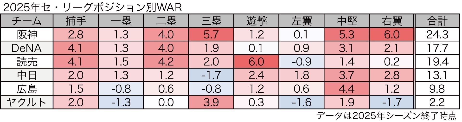 DELTAが2025年セ・リーグポジション別WARを公開する