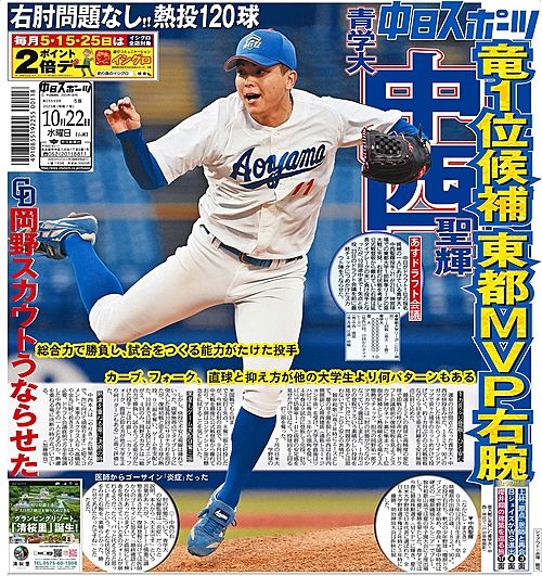 中日スポーツ、今日の一面は青学大・中西聖輝