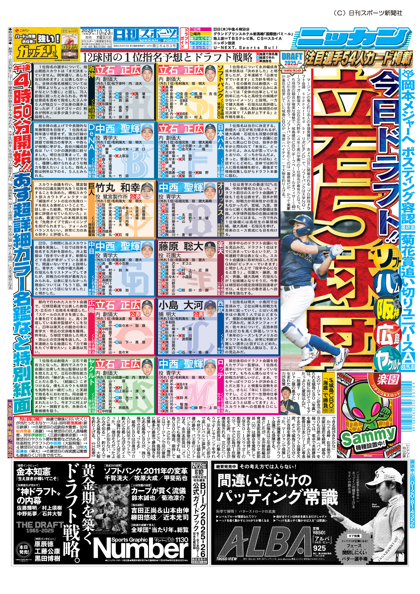 2025年『プロ野球ドラフト会議』当日、中日スポーツの一面・ドラフト1位予想は…
