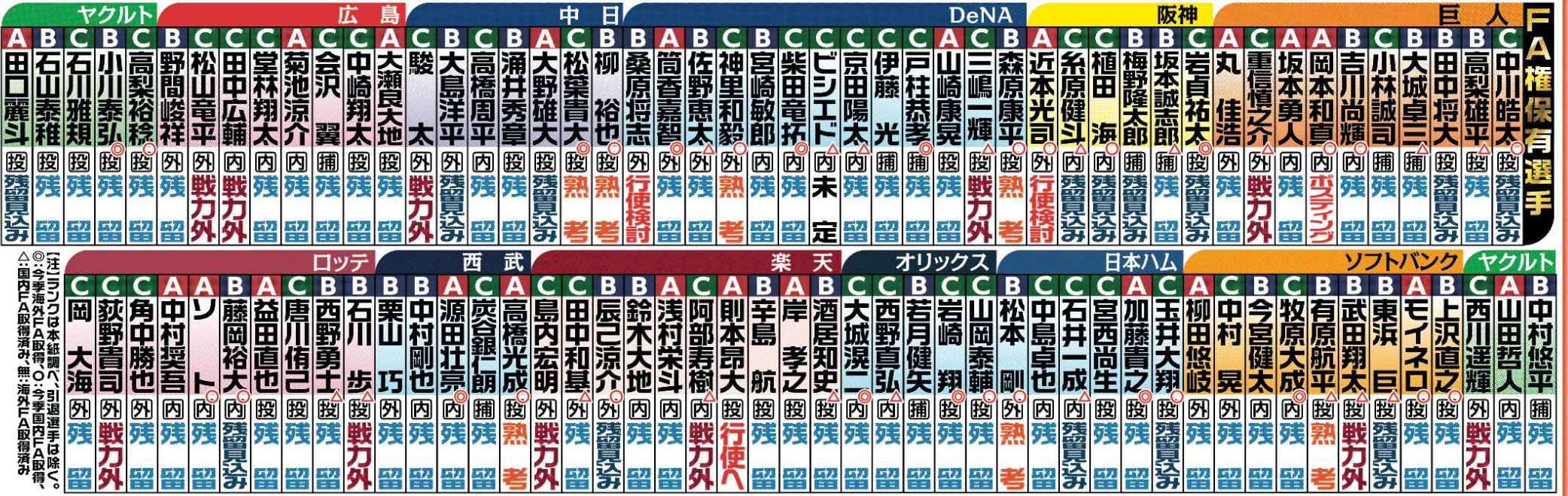 スポーツ報知「FA権利行使の手続き期間がスタート 権利保有選手を ズラーっと並べた一覧表です」