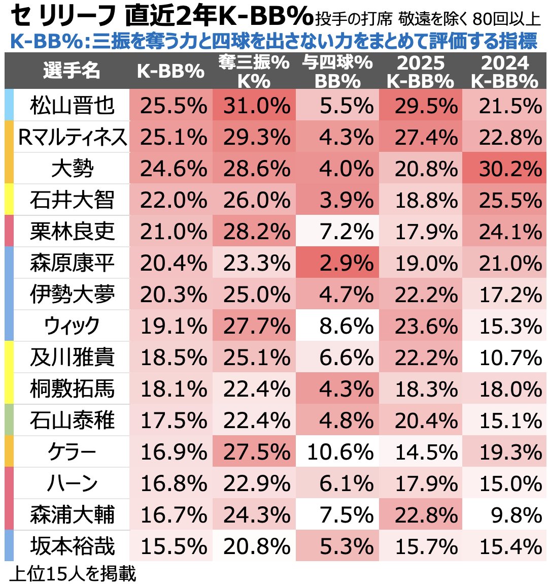 セ・リーグ、リリーフ投手の直近2年の投手K-BB%ランキング