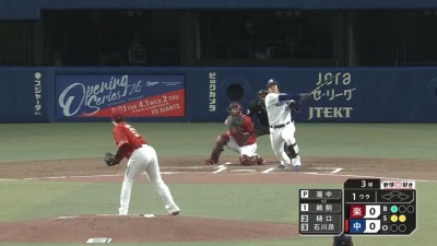 | 3 | 遊ゴロ|四 球|(盗塁成功)三 飛|左安①|右 安|一邪飛 | |