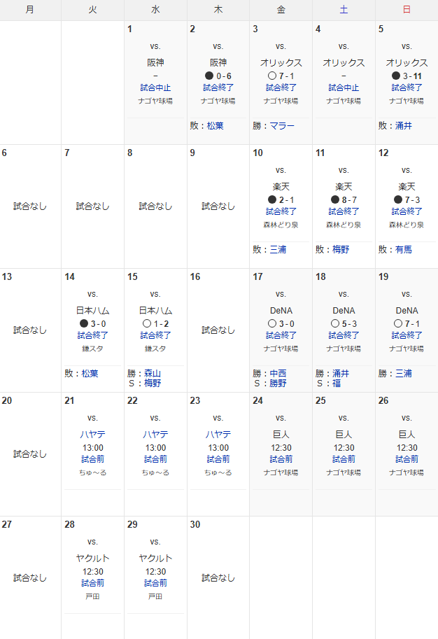 2026年04月21日 07:45 0コメント 中日ドラゴンズのもとけ中日ドラゴンズ2軍、ちゅ〜るスタジアム清水で試合へ 今後の試合日程 ツイート シェア はてブ 送る Pocket ■2026.04.20 中日ドラゴンズ2軍試合日程【4月】 中日ドラフト2位・櫻井頼之介が先発復帰!!! 中日・金丸夢斗「かみ合わない部分もありますけど、そこをなんとか僕たちが踏ん張って…」 今後の試合日程です。 にほんブログ村 中日ドラゴンズランキング《このブログの更新通知をTwitterで受け取る》《コメント投稿フォームまで移動する》